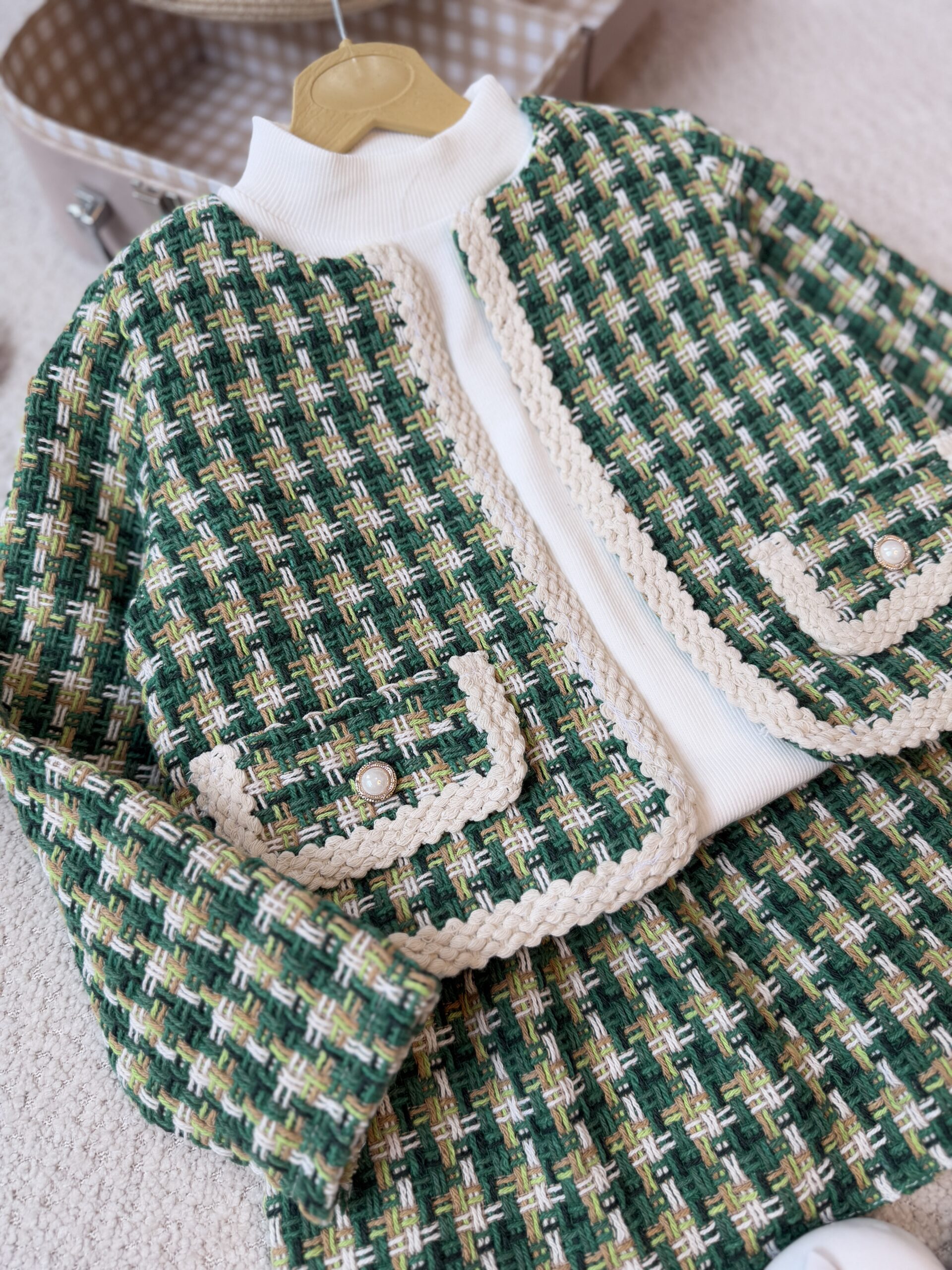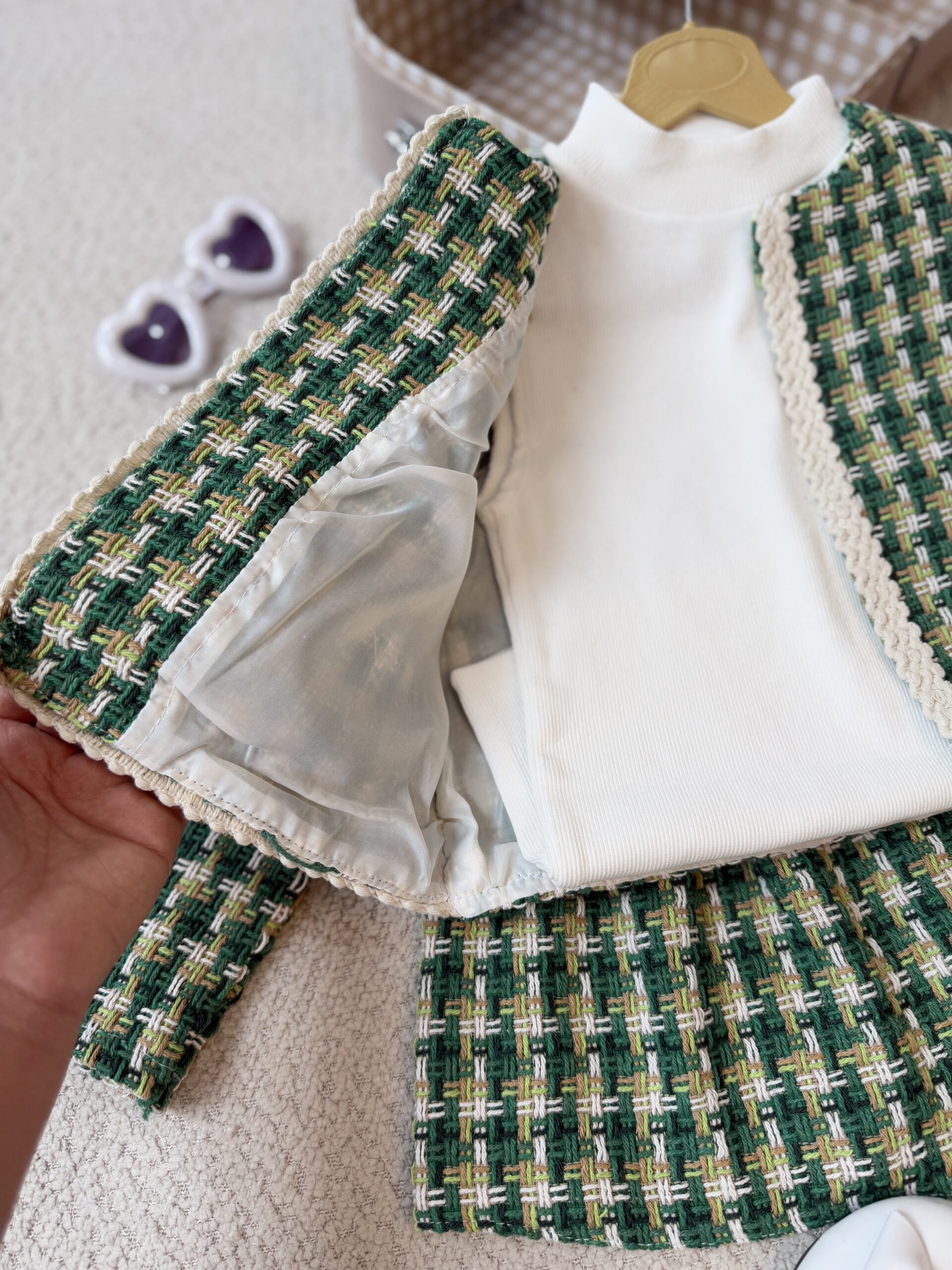 سه تیکه کت دامن سبزکمی بالاتر یه نوار باریک هست که علامت متر داره-ضربه بزنید جدول سایز باز بشه-سه تیکه شامل(کت-دامن-کراپ) جنس شنل بافت ضخیم- داخل کت آستردوزی شده