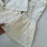 کمی بالاتر یه نوار باریک هست که علامت متر داره!کلیک کنید جدول سایز باز بشه-جنس گیپور کنفی گرم بالا هستش و کار آستردوزی شده